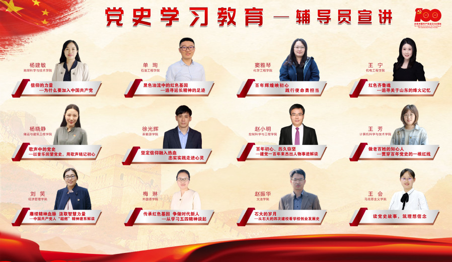 学校遴选组建党史学习教育辅导员宣讲团,开展集体备课讨论,重点从“初心使命、理想信念、赓续奋斗、石油精神”4个方面进行选题宣讲,聚焦青年学生成长成才,贯穿理想信念教育主线,强化思想政治引领和价值引领。