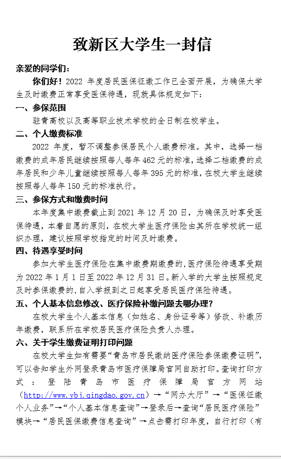 3.详细政策可参照《青岛市社会医疗保险办法》(青岛市人民政府令第235号)或到青岛市医疗保障局官方网站http://ybj.qingdao.gov.cn、青岛医保微信公众号、青岛西海岸新区医疗保障局微信公众号查询相关政策及解读。符合参保条件的学生,报名参保并成功缴纳费用后,方可享受所规定的医保待遇。