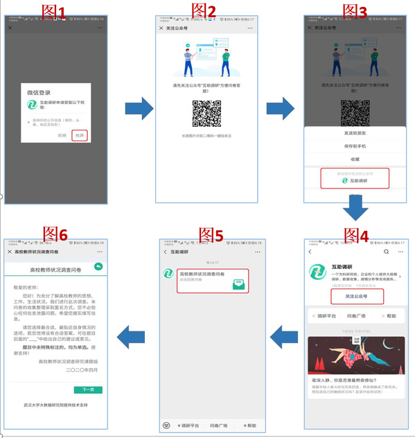(三)问卷填写。学生在收到问卷二维码后,使用微信扫码(识别图中二维码),关注“互助调研”微信公众号,系统将自动推送网络调查问卷,点击填写即可。具体操作流程如下: