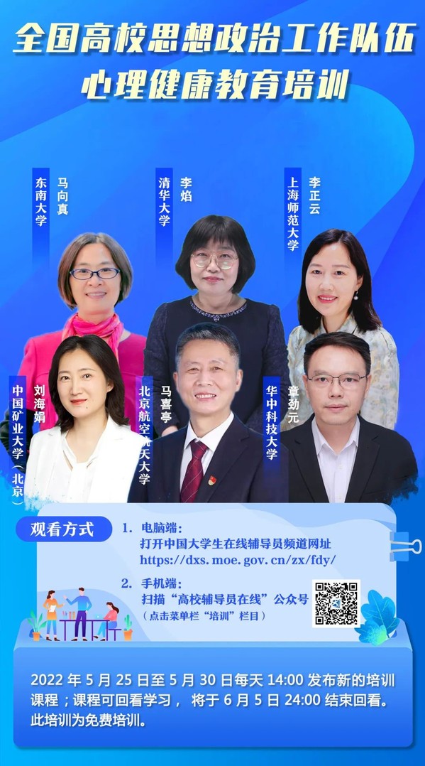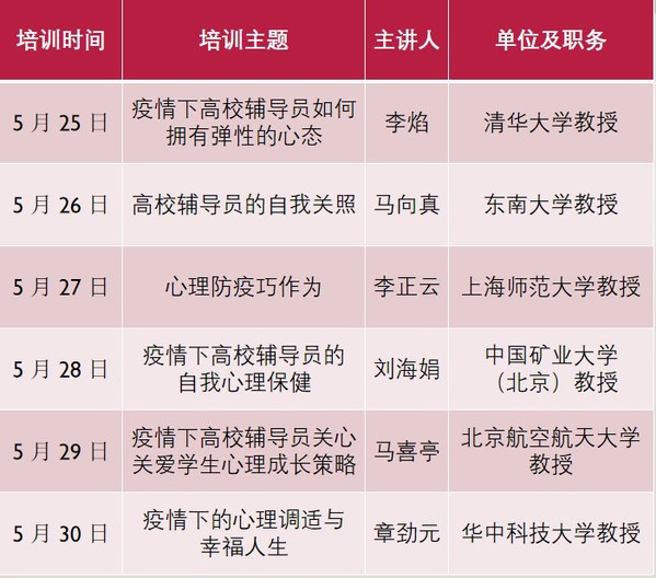 为进一步加强现阶段高校学生心理健康教育工作的针对性和有效性,及时准确掌握疫情防控期间学生心理诉求,分类分阶段做好关怀帮扶,引导学生形成奋发向上的意志品质和积极乐观的阳光心态,切实加强对思政工作队伍的能力提升和关心关怀,高校辅导员在线面向全国高校专兼职辅导员和心理健康教师开展心理专题培训,培训课程将于 5月25日-30日推出,由高校心指委专家聚焦疫情下的积极心态培育、压力纾解疏导和自我心理保健等重点内容讲授辅导,大力提升思政工作队伍有效识别心理问题、全面把握心理问题、精准指导心理问题的能力水平。请院部组织辅导员认真收看,并结合工作实际做好学习交流。