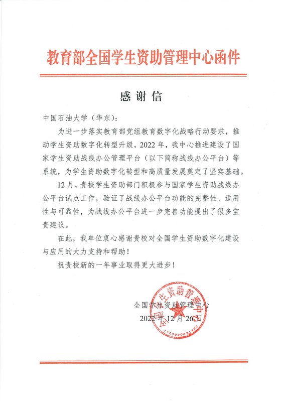 日前,我校收到教育部全国学生资助管理中心发来的感谢信,对学校积极参与国家学生资助战线办公平台试点工作表示肯定;对学校在全国学生资助数字化建设与应用中的大力支持表示感谢。