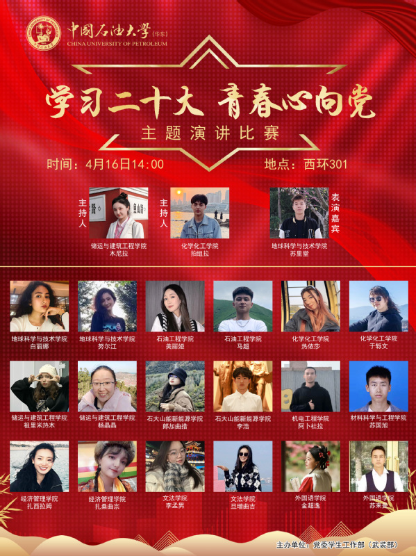为深入学习贯彻党的二十大精神,引领学生铸牢中华民族共同体意识,展示我校少数民族学生良好的精神风貌,将举办“学习二十大 青春心向党”主题演讲比赛决赛。