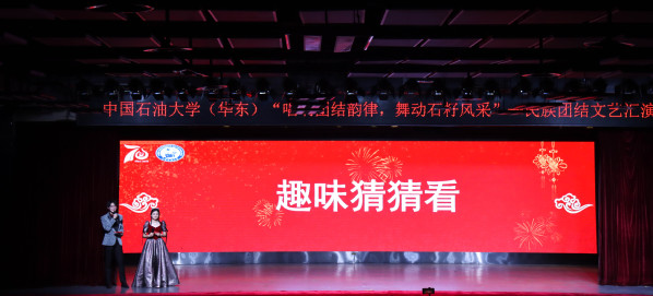 此外,由石大山能新能源学院、储运与建筑工程学院用冬不拉乐器演奏的器乐节目《灵动温婉的姑娘》和由经济管理学院、石大山能新能源学院带来的情景舞蹈剧《琴岛盛开格桑花》让观众们在体会民族文化的同时也能一览独特的民族风情。其中,藏戏是国家级非物质文化遗产,让非遗登上民族文化交流的舞台,也是一种对宝贵的民族文化资源的保护和利用。最后,文法学院学生和全体演职人员共同表演歌舞《美丽中国》。美丽中国不止美在山水之间,更美在五十六个民族的团结和谐。各民族学生携手表演,将爱传承。文艺汇演的互动环节也格外热闹,主持人在台上主持有关民族特色题目的抢答,答对者获得本次文艺汇演的纪念品一份。台下学生积极回应,气氛热烈。