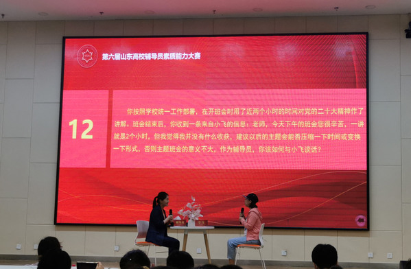 本次大赛由中共山东省委教育工委主办、山东高校思想政治工作创新发展中心(山东建筑大学)承办,全程包含基础知识测试、理论宣讲、谈心谈话和案例分析四个环节,旨在考察辅导员的理论素养、业务知识和育人实践,来自省内140所本专科院校的160余名辅导员同台比拼,最终产生一等奖10名,二等奖15名,三等奖25名。