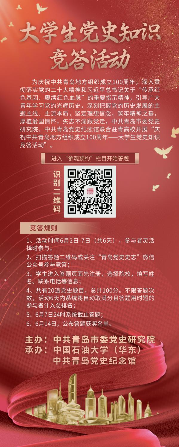 接中共青岛市委党史研究院、中共青岛党史纪念馆《关于联合举办大学生党史知识竞答活动的函》,为庆祝中共青岛地方组织成立100周年,深入贯彻落实党的二十大精神和习近平总书记关于“传承红色基因、践行初心使命,不断提升党的建设质量和水平”的重要指示精神,引导大学生学习党的光辉历史,深刻把握党的历史发展的主题主线、主流本质,坚定理想信念,筑牢精神之基,厚植爱国情怀,矢志不渝跟党走,中共青岛市委党史研究院、中共青岛党史纪念馆拟联合贵校共同举办“庆祝青岛党组织成立100周年——大学生党史知识竞答活动”。现将有关安排通知如下: