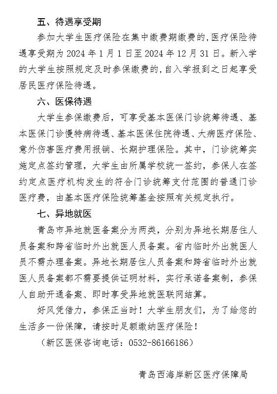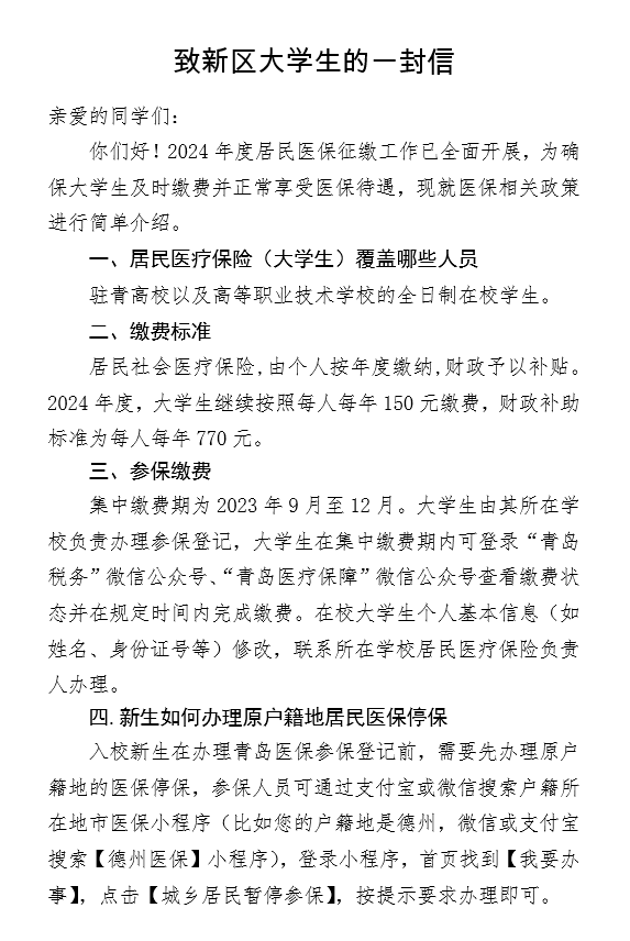 为做好我校学生2024年度青岛市居民医保参保缴费工作,根据青岛市2024年度居民医保政策及相关规定,结合学校实际,现将相关事宜通知如下:
