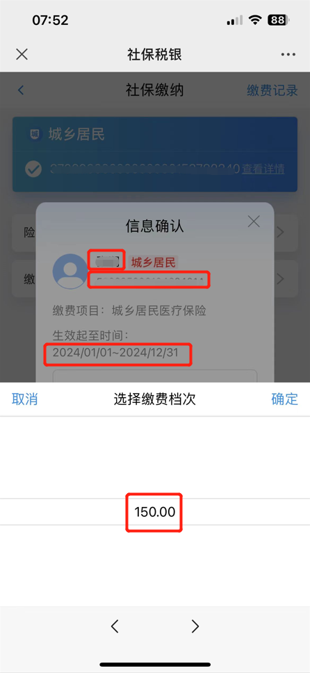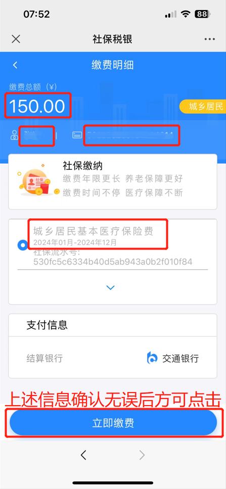 关注“青岛税务”微信公众号,点击右下方“微服务”中“社保缴费”,输入参保人的姓名、证件类型、证件号码,再按照下图所示,认真核查本人的各项信息,尤其是参保年度必须为2024年,缴费金额为150元,待缴信息正常,否则缴费错误将影响享受待遇,确认核对无误后,在线完成缴费。
