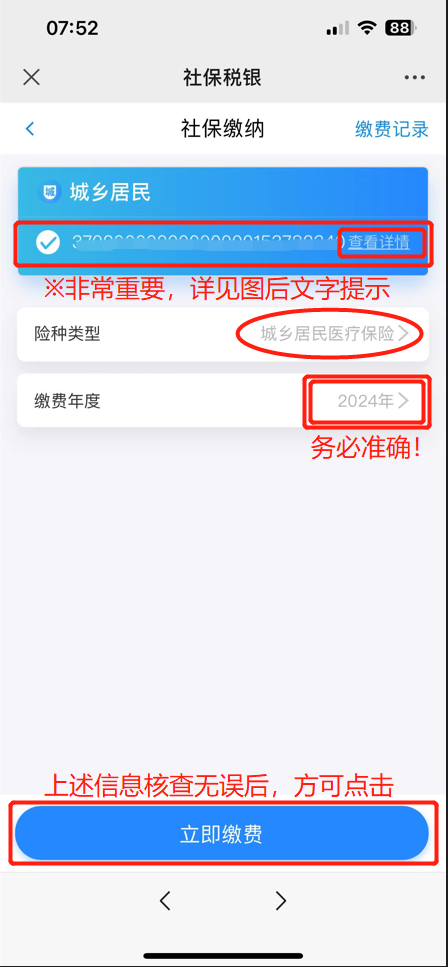 ※重要提示:如果此处有两条或多条记录,必须先逐条点击“查看详情”,进入后如果显示城乡居民待缴“待缴信息为空”,则不能选择本条记录缴费,切记切记!!!