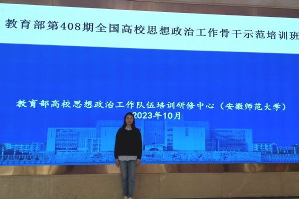 10月23日至26日,我校控制科学与工程学院辅导员曾菲赴安徽省芜湖市参加第408期全国高校思想政治工作骨干示范培训班,就“高校辅导员理论和实践研究能力提升”进行了专题学习并顺利结业。