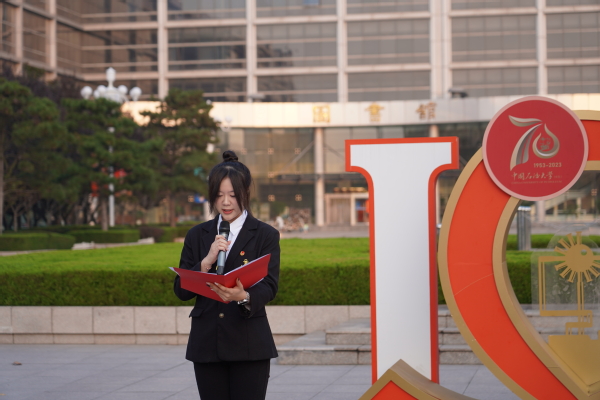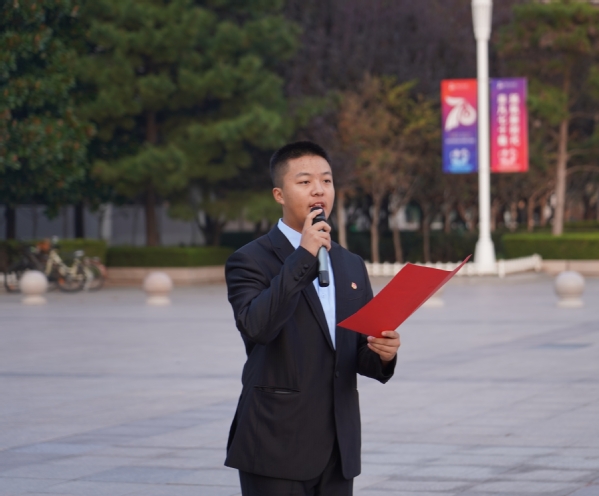建筑2302班张宇琳代表全体学生作国旗下的演讲,她谈到了对“青年”一词的理解,认为“青年”不仅仅是一个简单概念,指代着一个人生阶段、一段年龄阶梯,更是责任与担当的代名词,是奋斗与坚守的诠释。结合学校七十年追寻光荣与梦想的风雨沧桑之路,她希望每一位石大人都应该始终铭记并义不容辞地传承石大精神,延续石大的血脉和基因,并向广大团员青年发出倡议,要学习为先,精进不怠,要勇于创新,敢为人先,要修身齐家,厚德载物,要服务社会,奉献国家,做有担当、有责任、有本领、有潜力、有胸怀、有追求的石大人。