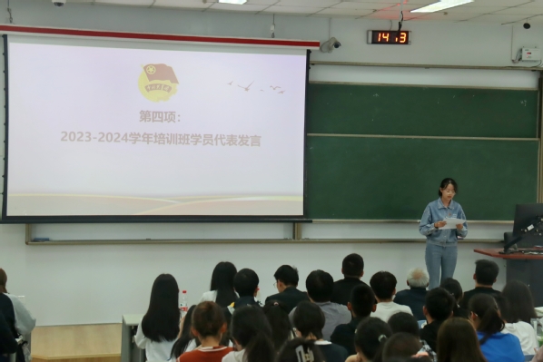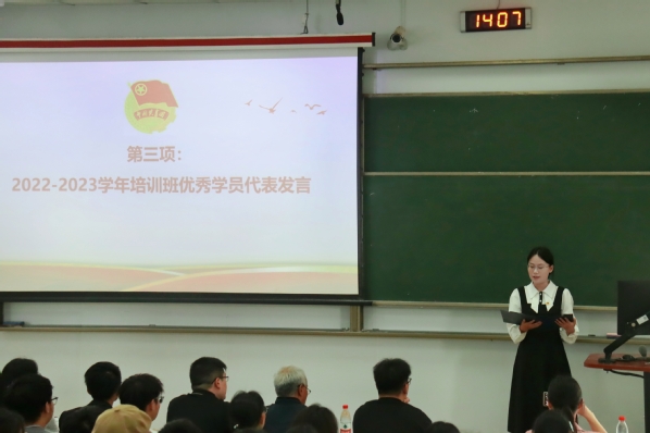 第三项由2022-2023学年培训班优秀学员代表马晓雯发言。首先她对上一期团校授课的老师表达了真诚的感谢,而后分享了她眼中的团校,并且从“学有所信,方能行远”“脚踏实地,勇攀高峰”“学以致用,逐梦远航”三个方面分享了自己的学习心得。马晓雯认为:“未来的路还很长,希望学弟学妹们在正确的人生道路上脚踏实地积蓄力量,有朝一日能展现才华,绽放光芒。”