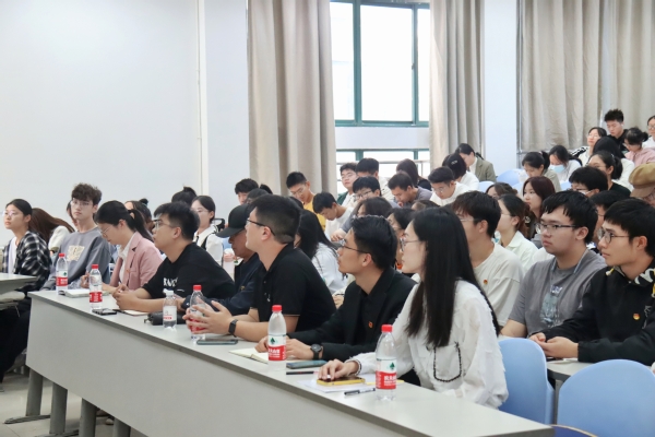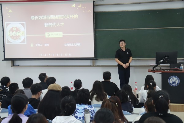 接下来,由马克思主义学院教师毕松主讲的团课第一讲开始。毕松以“成长为堪当民族复兴大任的新时代人才”为主题,从“总体规划,一体推进”“报效国家,奉献社会”“学好语言,大有可为”三个方面进行阐述,帮助学生全面理解教育、科技、人才“三位一体”部署的蕴意。毕松还结合个人经历对“何谓人才”“社会需要什么样的人才”“怎样成为人才”三个问题做出了系统的回答,为全体学员指引了前进的方向,提供了前进的动力。