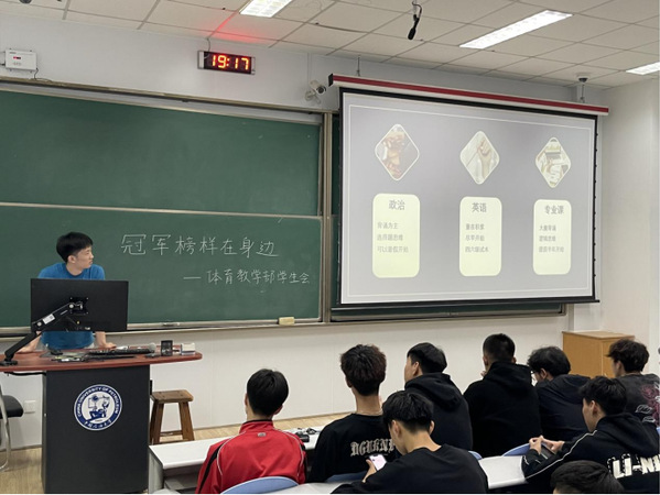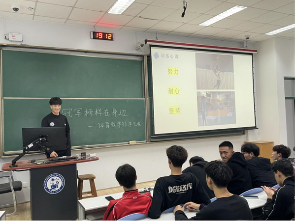 2023年11月2日,体育教学部学生会在西环102举行“冠军榜样在身边”主题分享会。此次分享会邀请到三位体育教学部2023级硕士研究生结合自身经历为大家分享学习技巧和经验,旨在充分发挥榜样引领作用,帮助低年级学生明确个人目标,把握学习方法,在学习、训练、生活各方面做出正确指引。