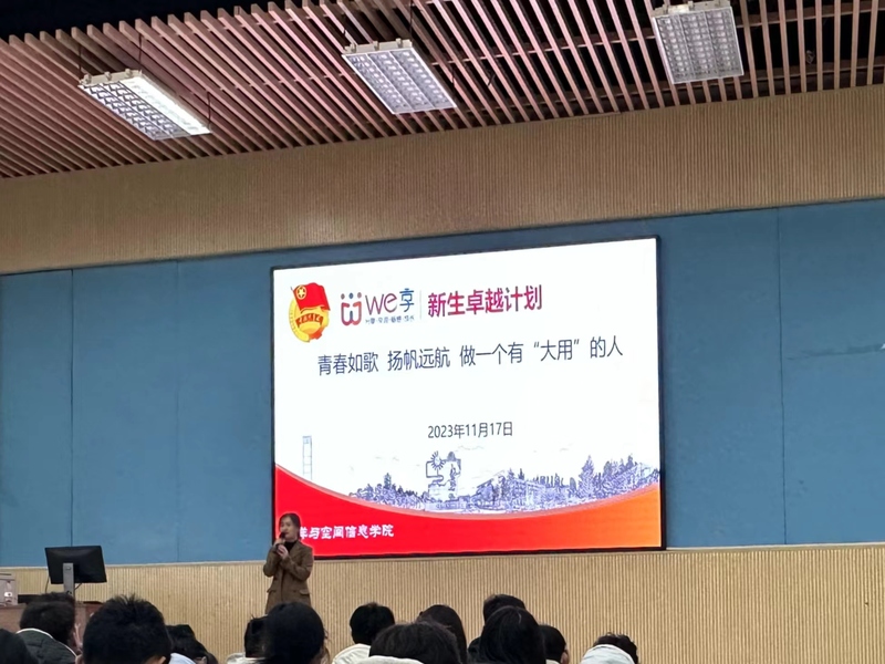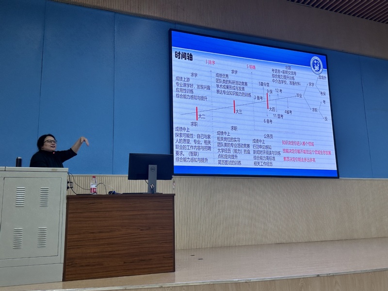 由窦雅琴老师进行“大学生学业与职业生涯发展规划”专题教育,强调了大学阶段的重要性:资源丰富,试错成本低,指出大学是学业与职业转换的关键期。从找到专业兴趣、明确职业方向、形成核心竞争力等方面向同学们介绍了如何更好地完成学业与职业的衔接,并帮助同学们认识自我、更好地制定发展方向。讲座最后,窦老师以时间轴的形式从求职、求学两方面分析学生可以在大学的每个阶段应该做怎样的准备工作。现场氛围热烈,学生纷纷表示,进一步明晰了个人的成长方向以及重点要发展的领域,地信2302班刘一凡表示:“如同莎士比亚所说‘人生就是一部作品,谁有生活理想和实现的计划,谁就有好的情节和结尾’。本次活动让我深刻意识到大学生进行生涯规划的重要意义,同时也激发了我对学习的热情,我们要学好专业知识,培养各项技能,成为能担当,能作为的有用青年!”