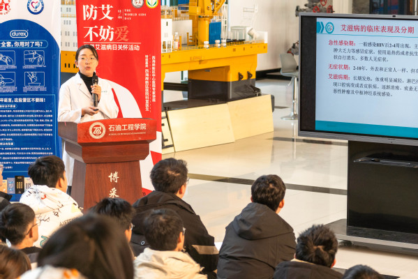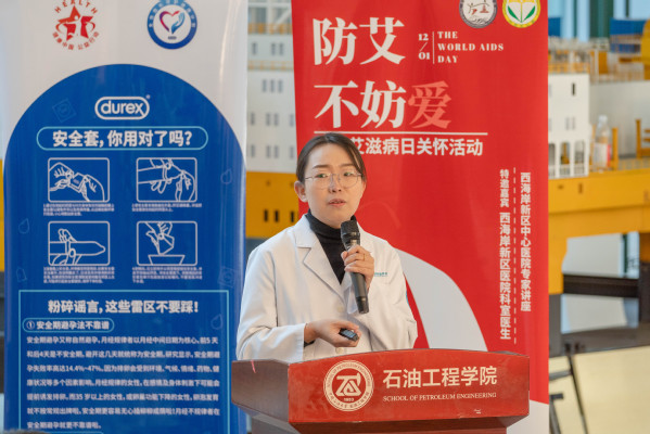 为帮助同学们掌握并了解艾滋病相关防治知识,推动创建友爱无“艾”、健康和谐的美好校园12月1日石油工程学院在工科B座博采书院大厅举办“防‘艾’不妨爱”世界艾滋病日主题教育宣传活动。本次活动邀请了青岛市黄岛区中心医院王传林医生杨玲医生郭璐璐医生出席,全校130名本科生代表参加活动。