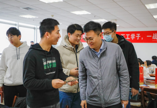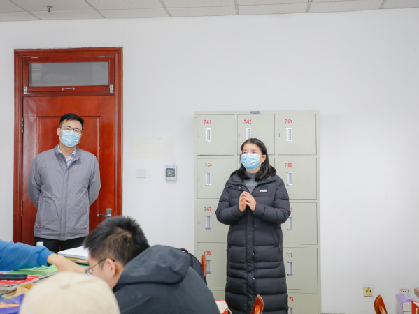 在发放礼包的过程中,王静、李昀泽、程然、王文辉等人与考生亲切交谈,关心学生备考状态。2020级辅导员李昀泽作动员讲话,他首先肯定了考研学子辛苦付出,之后他给同学们提出“坚定目标,坚持到底”“调节情绪,放平心态”“身体为本,劳逸结合”三点建议。考研重在坚持,在冲刺阶段要脚踏实地,不急不躁,备考的最后20天中,要学会释放情绪,保持愉快的精神面貌,注意饮食营养均衡,做好个人防护。最后他表示要相信时间不会辜负每一份努力,期待大家明年春暖花开时节捷报频传!随后王静、程然、王文辉也为考研学子加油鼓劲,祝福大家考研上岸。活动结束后,辅导员及各位代表安静走出研读区,各位考生也继续开始备考。