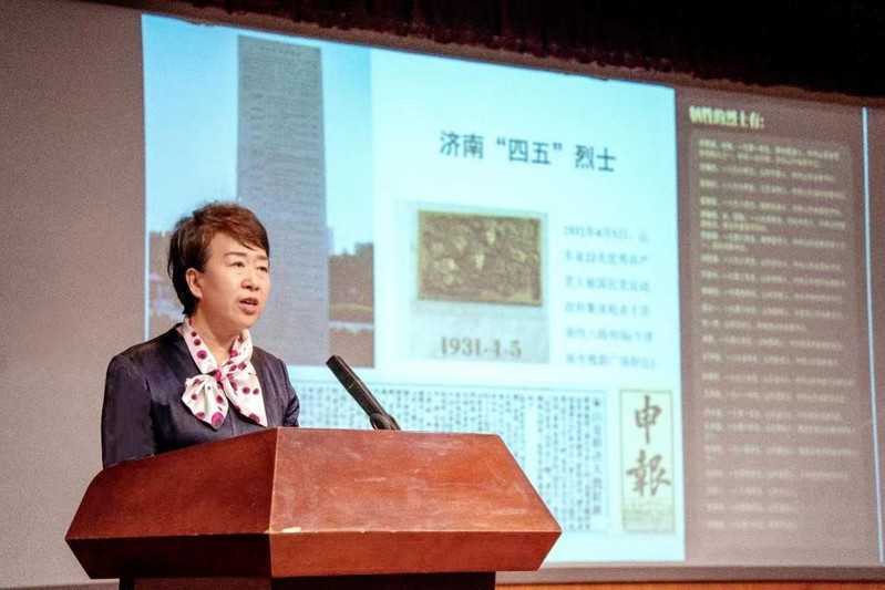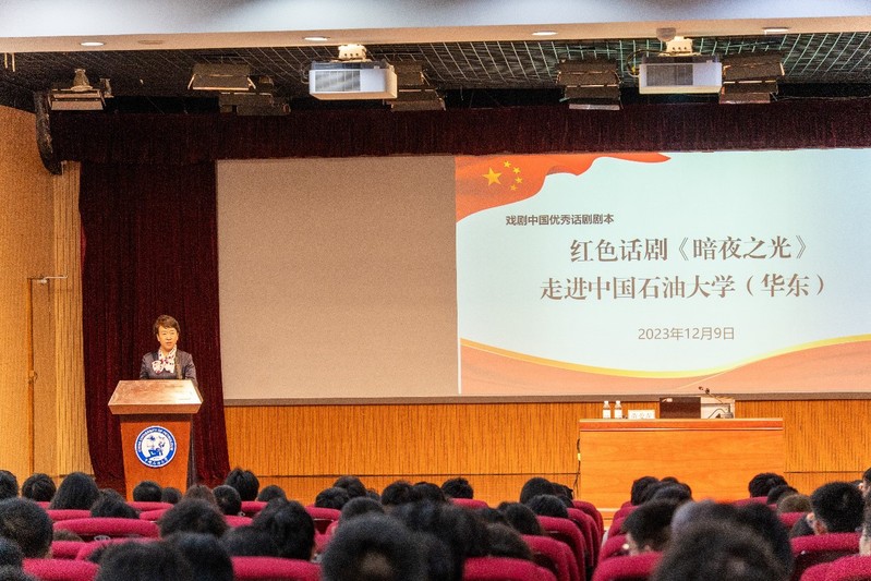 观看话剧后,苗爱萍以图文的形式为大家讲述刘谦初烈士的英雄事迹和《暗夜之光》创作幕后的故事。苗爱萍说,平度是刘谦初烈士的故乡,作为平度人的她深深地被刘谦初的事迹所打动,她在刘谦初的雕像前暗自发誓,一定要把刘谦初的事迹宣传出去。她和创作团队查阅了大量史料,深入了解了刘谦初的英雄事迹,专程赴北京采访了刘谦初的女儿刘思齐,让话剧中的细节更加完善,人物形象更加饱满,山东省话剧院作为高水平专业团队,在话剧排练演出过程中不断打磨提升,使《暗夜之光》这部话剧更富有感染力,真正发挥了其传递红色精神的作用。报告最后,她鼓励石大学子去追随光、创造光、成为光,让正道之光照亮神州大地每一个角落,彰显新时代大学生的责任和使命。听完苗爱萍讲述话剧幕后的故事后,同学们也对刘谦初事迹有了更加深入的了解,对《暗夜之光》话剧有了更加深刻的认识,通信工程专业2023级入党积极分子孙雅静表示:“今天的活动是一次特殊的党课,这部话剧带给了我极大的震撼,让我很受教育,很感谢苗爱萍老师和其他创作者们的付出,通过今天的红色文化进校园活动,我体会到了先辈们艰苦奋斗、在血与火的艰难岁月里铸就的敢于牺牲、无私奉献的革命精神,中国共产党的历史是最生动的教科书,中国革命历史是最好的营养剂,作为一名入党积极分子,未来我传承好红色基因,坚定理想信念,练就过硬本领,跑好属于我们这一代人的接力棒。”