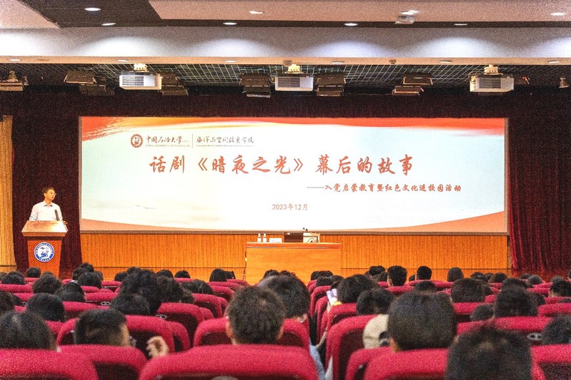 为激励师生党员、青年学生学习革命先烈精神,赓续红色血脉,传承红色基因,矢志不渝为实现中华民族伟大复兴而奋斗,12月9日,海洋与空间信息学院在逸夫楼二楼报告厅开展入党启蒙教育暨红色文化进校园活动,组织观看“戏剧中国”优秀剧本话剧《暗夜之光》视频,并邀请平度市融媒体中心原党委书记、编剧苗爱萍为大家讲述话剧幕后的故事。海洋与空间信息学院师生党员、入党积极分子、2023级全体新生等近500人参加本次“特殊党课”。海洋与空间信息学院党委副书记于华帅主持本次活动。