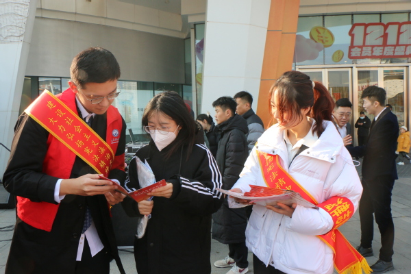 12月4日,文法学院师生于吾悦广场开展线下普法宣讲活动。活动期间,宣讲成员向广大市民分发宪法知识宣传单,并对宪法知识进行细致讲解,面向社会大众传递法治声音。对于阅读困难的老年人,宣讲成员将严谨的法律条文转化为生动易懂的事例进行解释,力求达成最优宣讲效果。