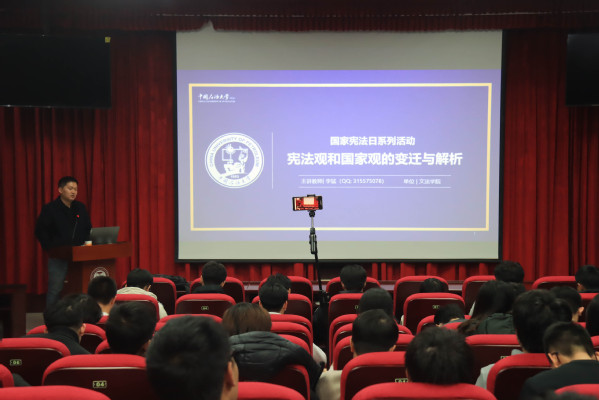 12月4日晚,文法学院主办的宪法专题讲座“宪法观与国家观的变迁与解析”在文理楼142举行,由法学系教师李猛主讲。讲座开始,李猛提问宪法相关问题,在场学生积极回答,气氛热烈。随后,李猛结合具体事例对宪法内容进行生动解读,并从历史的角度详细讲解宪法观。在对宪法进行详细阐述之外,李猛还与在场学生对宪法意义及当代大学生如何运用宪法等问题进行探讨。“宪法是伴随我们一生的,学习宪法最重要的培养自己兴趣,因为只有兴趣才是最好的老师。”李猛鼓励学生培养学习宪法的热情,调动在场学生学习宪法的积极性。