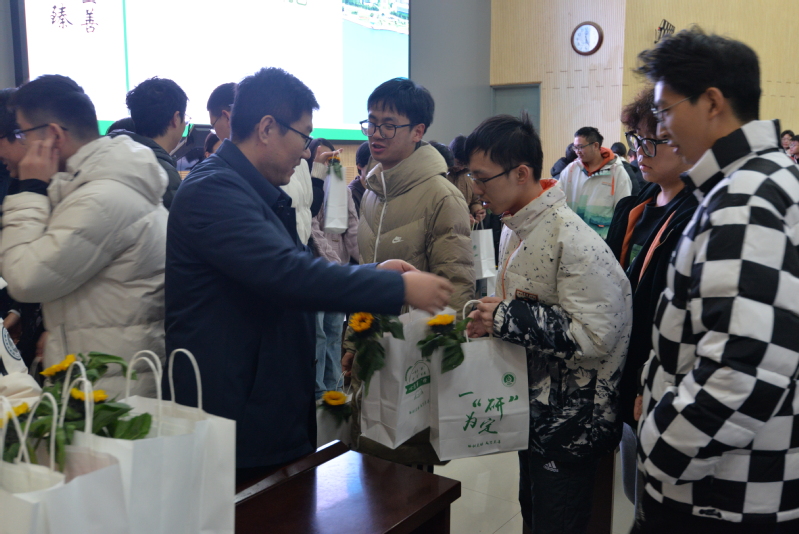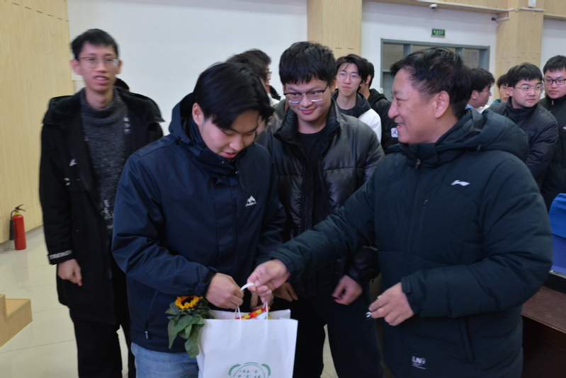 会议最后,门小刚、孙启龙与王佳为学生发放“爱心大礼包”,礼包内有薯片、中性笔、向日葵、橙子等,希望学生们能够心有所“薯”、妙“笔”生花、一举夺“葵”、一战“橙”硕!