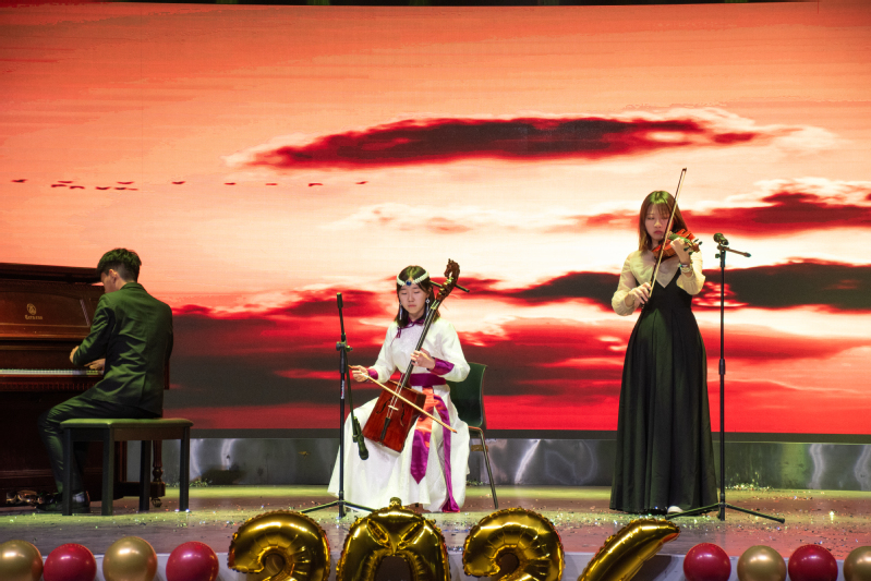 伴随着悠扬的钢琴声,元旦晚会拉开帷幕。舞蹈《幻想童话》和啦啦操表演展现了青春活力;歌曲《失眠飞行》《光阴的故事》《千里之外》《乌兰巴托的夜》、舞蹈《Light it up》等则为全体同学呈现了一场精彩的视听盛宴;从古韵悠长的古筝到清新灵动的竹笛,从细腻的小提琴到动感的非洲鼓,从悠扬的马头琴到优雅的钢琴,器乐队的同学们带来的《青花瓷》《Golden hour》《安河桥》等节目为观众展现了和谐而丰富的“音乐画卷”,为晚会增添了独特的色彩和魅力;相声《一本正经的反诈手册》用幽默风趣的方式为观众宣传防范电信诈骗的相关知识;由2023级学生自编自导自演的影子剧《青春之影》与歌曲《让我留在你身边》,回顾了新生与石大相遇的三个月的难忘瞬间,表现了同学们对未来的憧憬和信心;小品《真相只有一个》讲述了“抵制校园内偷外卖”的故事,既轻松幽默,又蕴含道理;朗诵节目《行经故梦,盛世华章》中,表演者用铿锵有力的声音表达着家国情怀;最后,晚会在《相亲相爱》大合唱中圆满落幕。