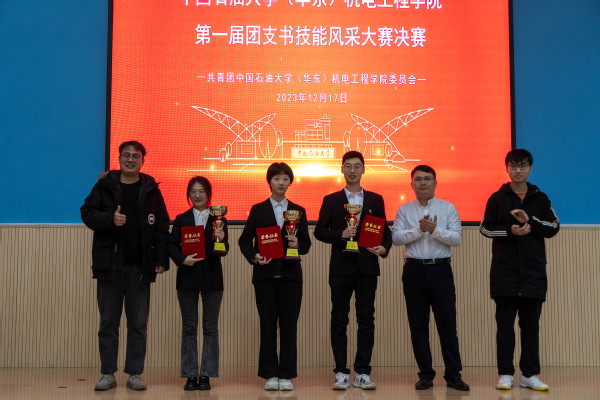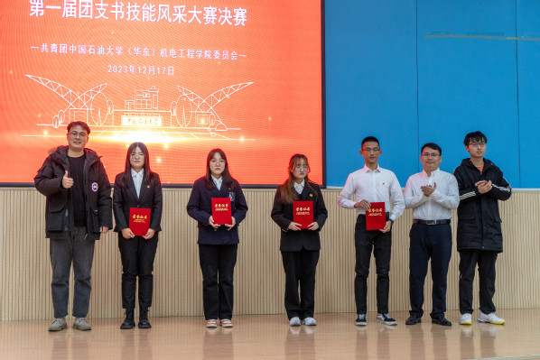 比赛正式开始前,徐梓涵介绍决赛规则:选手在准备时将抽取题目并构思如何作答,参赛选手首先将围绕个人简介、主要成就、工作内容、支部风采等内容进行现场展示,限时五分钟。随后选手复述抽取的题目后进行两分钟的现场作答。评委老师根据风采展示和问题作答对参赛选手进行现场打分。随后,决赛正式开始,十三位参赛选手依次上台,围绕主题进行发言与展示。在两分钟的临时作答里,都给出了令人比较满意的回答,展现出各自的风采与优秀的应对能力。在参赛选手的答辩全部结束后,由徐梓涵宣布最终的比赛结果:吕振布、金桐桐、牛景雪三人获得一等奖,高枝秀、姚烁等四人获得二等奖,王香源、罗蓉蓉等六人获得三等奖。随后,由四位评委老师分别为获奖选手颁发奖状和证书,并合照留念。大赛最后,霍添进行总结发言,他表示,通过本次比赛锻炼了队伍,找到了问题,发现了差距,希望23级的团支书能加快学习的脚步、见贤思齐,22级的团支书能加快成长,向学校红旗团支部以及更高的集体荣誉发起冲击。
