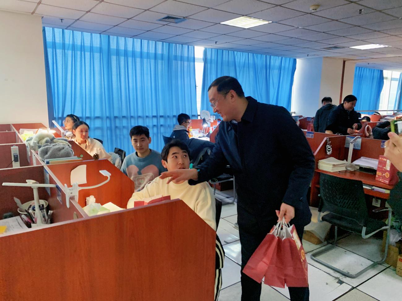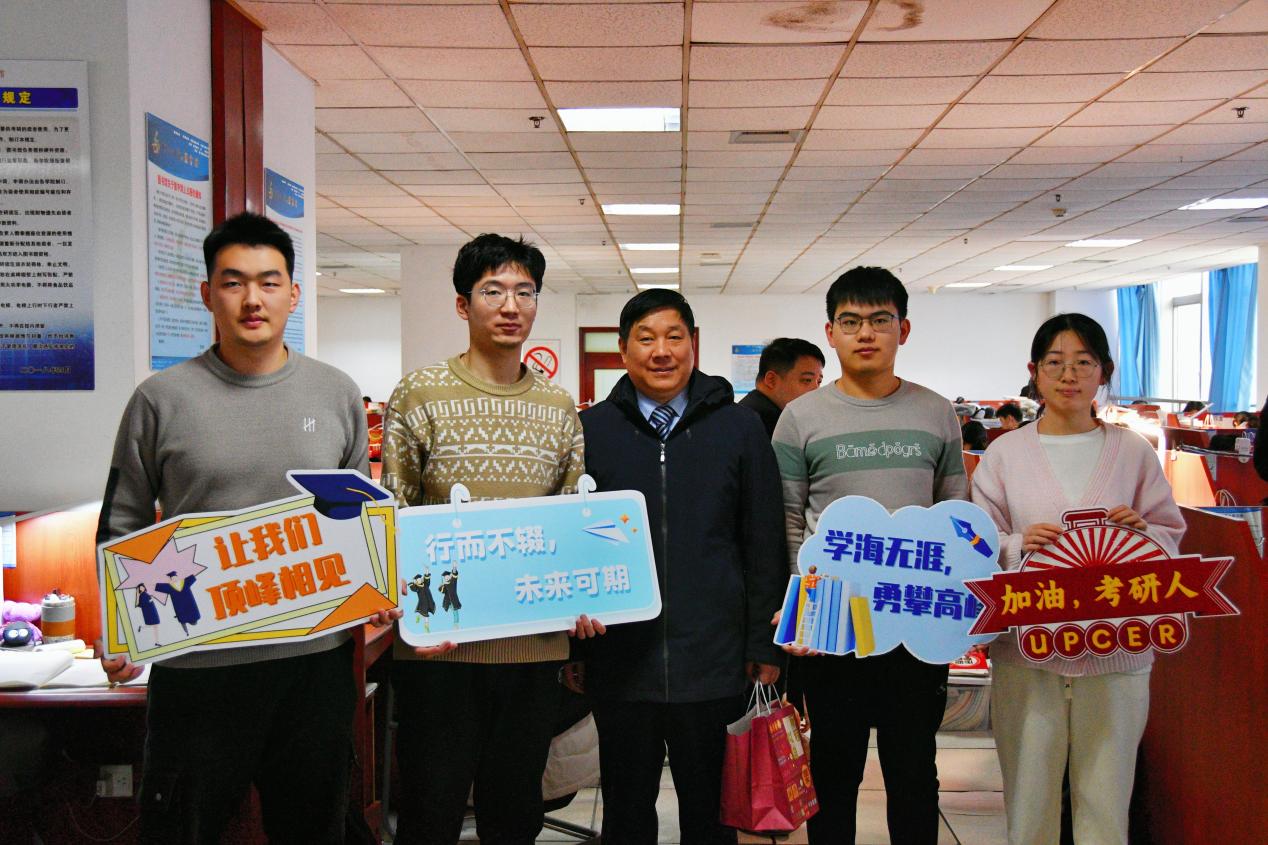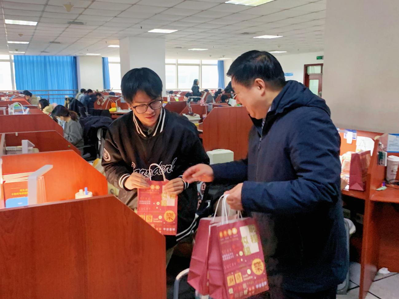 2024年研究生考试在即,为鼓舞我院学子考研士气,坚定考研信心,缓解备考压力,12月17日上午,学院于图书馆考研自习室开展“E路前行,研途相伴”2024届考研慰问活动。院长庞善臣、院党委副书记王玉平、2020级辅导员王芳及各班学生干部深入考研自习室,为备战考研的学子送上暖心礼包和温暖祝福,助力180余名考研学子“研冬”折桂!