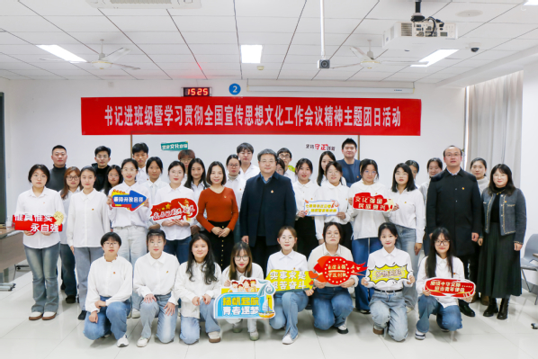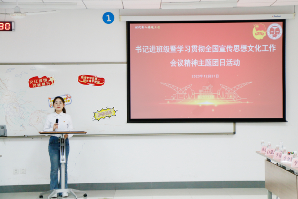 为学习贯彻全国宣传思想文化工作会议精神和习近平文化思想,12月21日,校党委副书记马国顺深入文法学院汉语2201班,指导班级开展学习贯彻全国宣传思想文化工作会议精神主题团日活动。活动由汉语2201班班长、团支部副书记孙熙谌主持。文法学院党委副书记陈熙、全体辅导员、汉语2201班班主任张袁月参加活动。