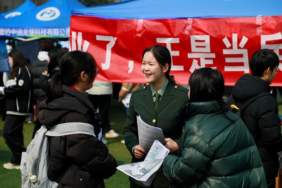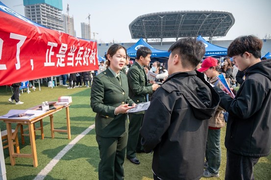强化党建引领,当好入伍参军“宣传员”。“同学,你好!现在是春季征兵期,你有当兵的意向吗?可以了解政策、报名参军”……在招聘会征兵宣传展位,宋佳佳等退役大学生身着军装,为前来咨询的毕业生发放征兵宣传单,认真讲解当前国防建设与军队建设对高素质人才需求的迫切性,从应征条件、入伍流程、优待政策、毕业生参军入伍优势,入伍体检,分配地区等方面向前来咨询的毕业生进行了详细的介绍,使同学们进一步了解了今年大学生入伍的各项优惠政策, 有效激发毕业生携笔从戎、投身国防的热情。