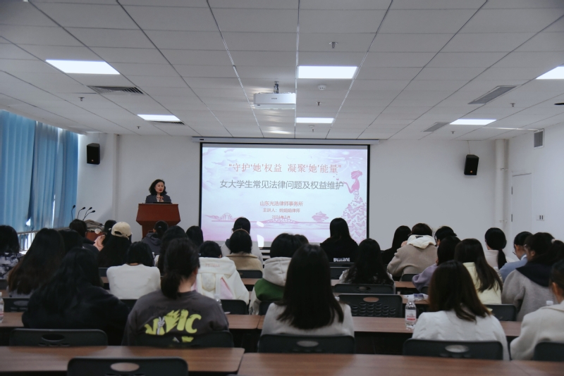为提高女大学生自我保护意识和自我保护能力,切实维护女大学生权益,3月19日下午,由校团委主办,材料科学与工程学院团委承办的“守护‘她’权益,凝聚‘她’能量”女大学生权益维护专题讲座在古镇口校区新能源大厦237报告厅举行。本次活动青岛西海岸新区最美法律工作者、山东光浩律师事务所律师姚娟娟应邀担任主讲人。