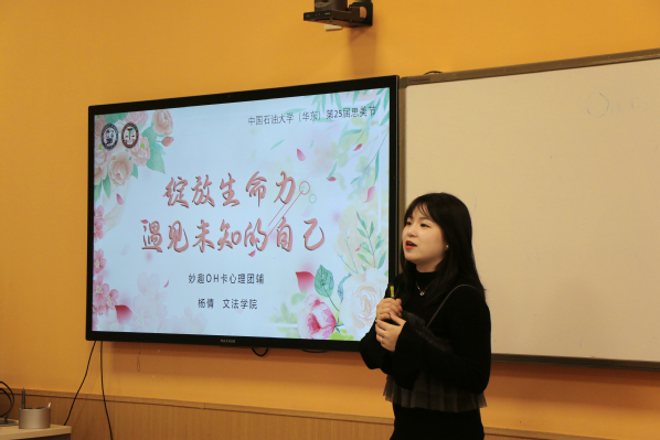 相知相言,同心同行。为加强心理健康教育,培育学生良好的心理素质,3月20日,在第二十五届思美节之际,文法学院于南堂502教室开展“绽放生命力,遇见未知的自己”妙趣OH卡主题心理团辅,活动由国家三级心理咨询师、学校心理中心兼职咨询师、文法学院专职辅导员杨倩主持,各学院学生参与。