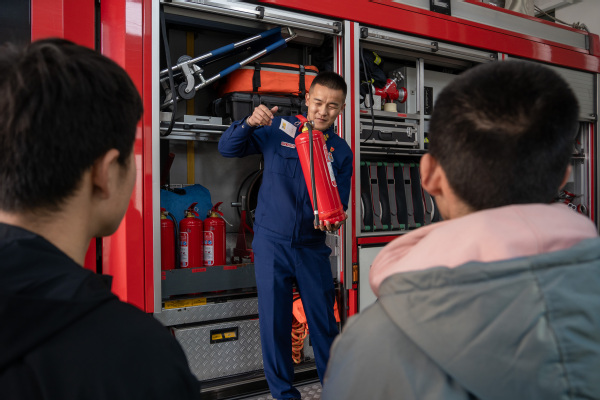 沉浸式体验消防生活,零距离感受“蓝焰”魅力。活动中,同学们在聂队长的带领下,以“观、听、摸、试、问、答”广泛开展零距离体验消防队伍生活与消防安全常识。在消防车旁,消防队长聂昌宝首先介绍了热成像仪、救生照明灯,切割机,液压顶杆等消防专用器械的功能、使用方法及适用范围,并进行现场操作演示。同时,聂昌宝队长用通俗的语言为同学们全方位讲解、多角度的答疑,详细讲授了各类灭火器的用途与适用场合,并适时教授发现初期火灾时的一些扑救方法。他通过假设火灾情景,以“问答”形式向同学们传授身处火场、人员密集场所该如何逃生等安全避险常识,让大家更加理解和牢记消防安全知识。