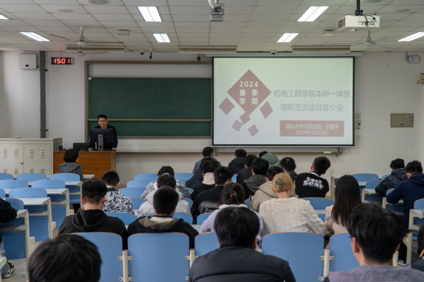 为开拓学生国际眼界,了解国际化交流政策,为学生出国留学打下基础,3月23日下午,机电工程学院于南教楼207室召开国际交流项目宣介会,本次宣介会邀请国际合作与交流处孙路平老师主讲,学院团委书记、外事秘书霍添主持,各年级辅导员出席,19-21级本研一体班学生参加。