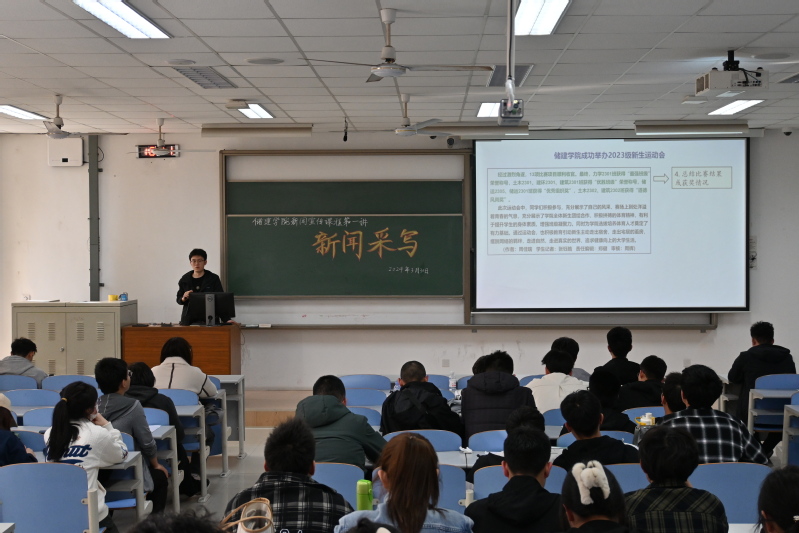 最后,马尉博以“储建学院与石工学院联合举办新闻宣传沙龙活动”和“储建学院成功举办2023级新生运动会”两篇新闻稿为例,开启了第二部分《新闻采写》的讲解,他从基本内容、专业知识、常用句式等三方面分享了新闻的五个重要部分即标题、导语、主体、背景、结语的写作方法。课上,学生宣传骨干们认真聆听记录,积极与主讲人互动,回答新闻相关问题,现场效果较好。