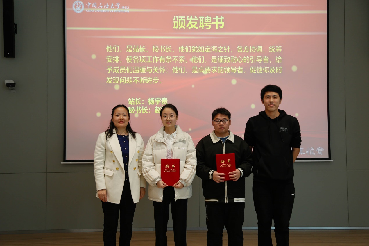 吕晶晶老师和武栋老师为站长杨宇贵秘书长赵知宇颁发聘书 宋欣芮摄