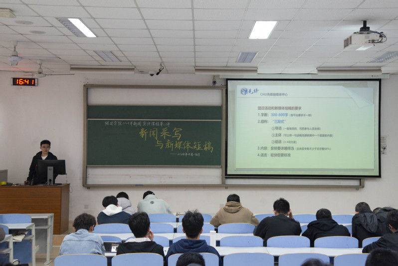 为进一步培养和提升学院学生记者、各学生组织新闻宣传负责人的新闻采写能力,4月13日,由储建学院团委指导,CHU先锋融媒体中心组织开展的2024年储建学院新闻宣传素养提升课程在南教109教室举行第二讲。本科课程由CHU先锋融媒体中心记者部部长马尉博主讲,融媒体中心成员,各学生组织、班团的宣传负责人参加培训。