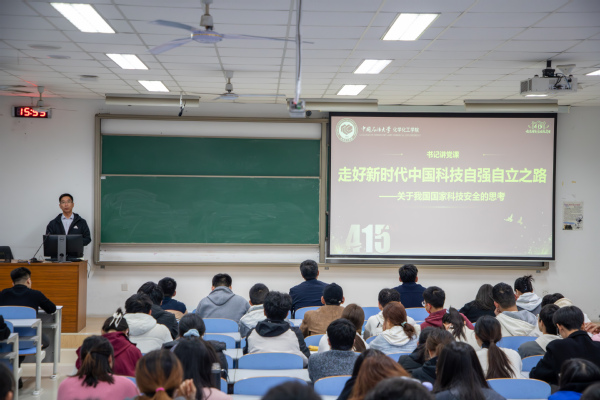 为深入学习贯彻总体国家安全观,落实《教育部关于加强大中小学国家安全教育的实施意见》等文件要求,增强师生国家安全意识,4月14日下午,在第9个全民国家安全教育日来临之际,化学化工学院组织开展国家安全教育日主题教育活动,学院党委书记张永宁为师生讲授题为《走好新时代中国科技自强自立之路——关于我国国家科技安全的思考》的主题党课。学院党委副书记徐光辉,各年级辅导员、学院各支部党员代表、发展对象、积极分子参加了此次活动。