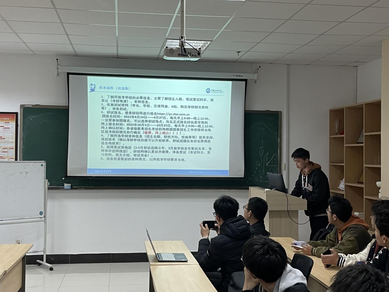 2021级辅导员任金恒鼓励大家向优秀的学长学姐学习,建议同学们根据自身实际情况制定好计划,脚踏实地、满怀信心、认真备考。兼职辅导员崔国庆也对现在的考研形势进行了分析,提醒同学们要有毅力、有韧性、能坚持;要摆正心态、正视最终结果。