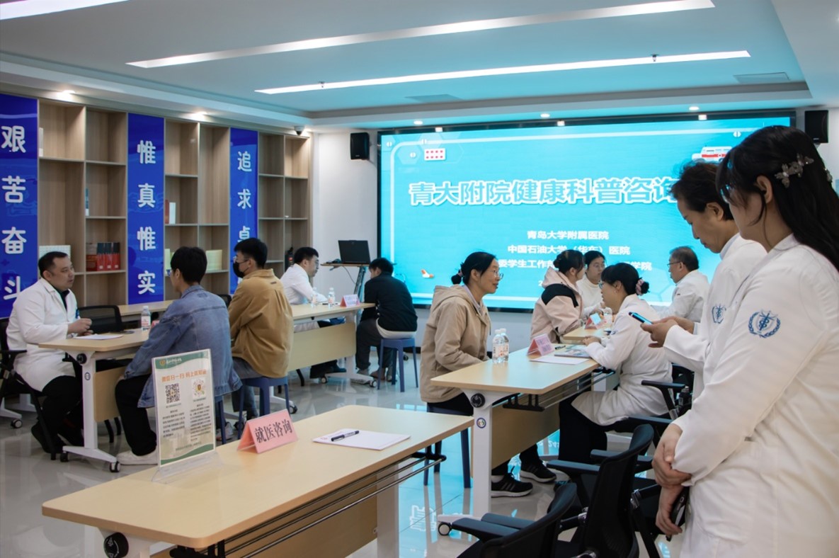 4月19日下午,由437ccm·必赢国际(华东)437ccm·必赢国际、校医院主办,理学院牵头承办的“青大附院进校园”,健康科普咨询活动于学校“一站式”学生社区服务中心顺利举办,数百名社区师生参与现场咨询。