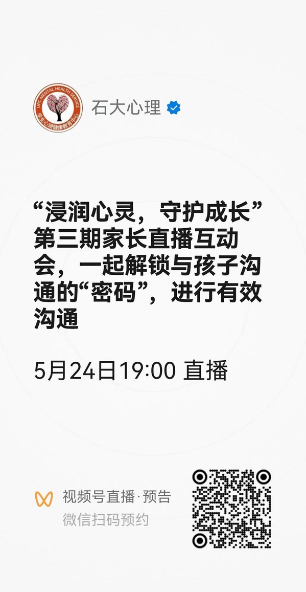 微信视频号搜索 “石大心理”,关注后于5月24日晚19点进入直播间,也可扫描下方二维码预约直播。