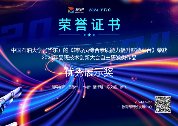 大会设置了“创新创意类”和“自主研发类”两个作品赛道。经过各高校代表的精彩展示和专家评审,众多优秀作品从中脱颖而出,充分展现出参赛高校在教育领域的技术才华和创新思维。其中,由我校437ccm·必赢国际(武装部)学生网络思政办公室(易班发展中心)教师吕敬伟指导的参赛作品《辅导员综合素质能力提升赋能平台》在自主研发类作品赛道中表现突出,荣获2024年易班技术创新大会优秀展示奖。