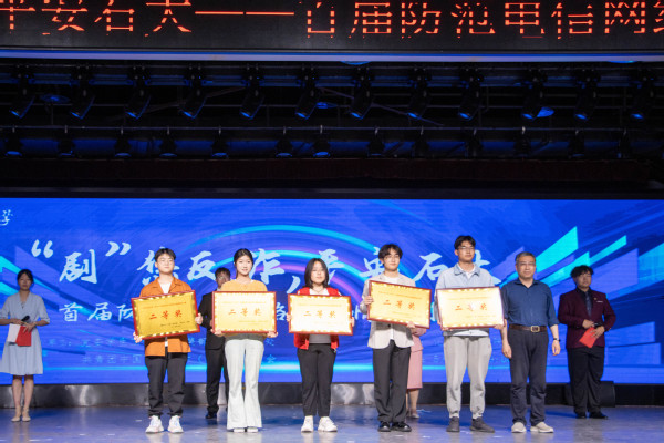 颁奖仪式 三等奖 李昕航摄本次防范电信网络诈骗情景剧大赛学校16个院(部)精心准备了包含7种常见诈骗手法的15个节目,生动展现复合型刷单诈骗、两卡诈骗、冒充电商物流客服诈骗、冒充熟人诈骗、网络刷单诈骗、网络游戏虚假交易诈骗、注销校园贷诈骗等大学校园案发率较高的几种骗局,普及了防骗反诈知识。姜雪警官观看情景剧后评价:“通过情景剧来演绎常见骗局,宣传防范电信网络诈骗知识的形式,可以切实增强学生的识骗防骗意识,真正做到入脑入心。”本次比赛共评选一等奖3名、二等奖5名、三等奖7名,理学院、计算机科学与技术学院、文法学院荣获一等奖。