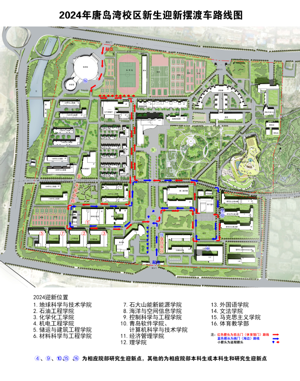 3.唐岛湾校区,学校在南门和西北门(体育馆门)内部设有迎新点,学生和家长可乘坐循环行驶的迎新摆渡车或者步行前往各院(部)迎新报到点(《2024年迎新场地划分及校内摆渡车行车路线示意图》见附件),建议机电工程学院、储运与建筑工程学院、材料科学与工程学院、海洋与空间信息学院、控制科学与工程学院、青岛软件学院、计算机科学与技术学院、体育教学部学生和家长通过西北门(体育馆门)入校。古镇口校区在学校北门内部设有迎新点。院(部)本科生和研究生迎新点报到时间为8月31日7:30-18:30、9月1日7:30-16:00。