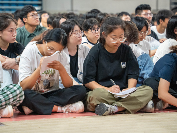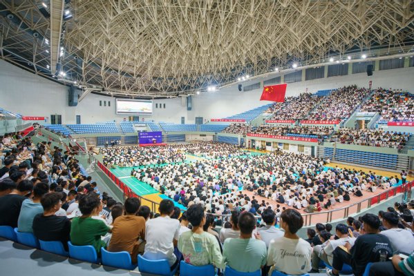 全体新生听讲座 王麒淼摄“相信‘相信’的力量!”9月11日晚,这条充满力量的口号在我校体育馆内回响。