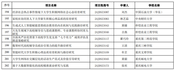 长期以来,我校高度重视大学生思想政治教育和辅导员队伍建设,鼓励支持辅导员围绕工作中的重点难点问题开展理论研究和实践探索,通过多层次辅导和全方位保障,有效提高了高层级项目申报的数量和质量,助力辅导员队伍业务与科研能力双向提升、双向赋能,全面推进辅导员队伍专业化职业化专业化发展。据悉,本年度教育部人文社会科学研究专项任务项目(高校辅导员研究)共立项202项。