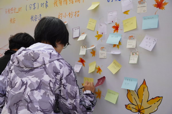 另一边的摊位上,“坏情绪垃圾箱”和“快乐分享箱”内已经放满了学生们写下的便利贴。学生们需要写下两张便利贴,一张倾诉自己的烦恼,另一张记录自己日常生活中遇见的“小确幸”。“希望以后成绩能好一点”“今天看见了一朵很漂亮的云”……学生们在分享自己的烦恼与快乐时,也对自己的情绪有了更加深刻的认识,从而更好地调试自己的心理状态。