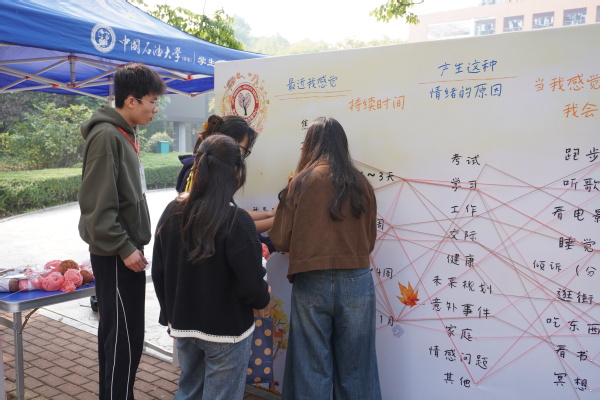 参与人员共同编织“情绪之网“高雨佳 摄路边的展板上 ,由学生们共同编织的“情绪之网”已经逐渐成型。展板上分有几列有关情绪的选项,每一个选项上有匹配的钉子,学生们需要一步步将绳子缠绕在自身对应的选项上,在缠绕绳结的过程中,剖析自己的情绪,更好地认识、接纳自己,收获属于自己的“情绪之线”。“非常有新意的活动!我的情绪之线是:最近我因为考试感觉紧张,已经持续3天了,我会通过跑步来面对这种情绪。它让我开始复盘我最近的情绪与状态,特别是我发现有一位同学的和我的选择几乎一模一样,我觉得很神奇也很有缘分。”来自文法学院的牛静雯表示。
