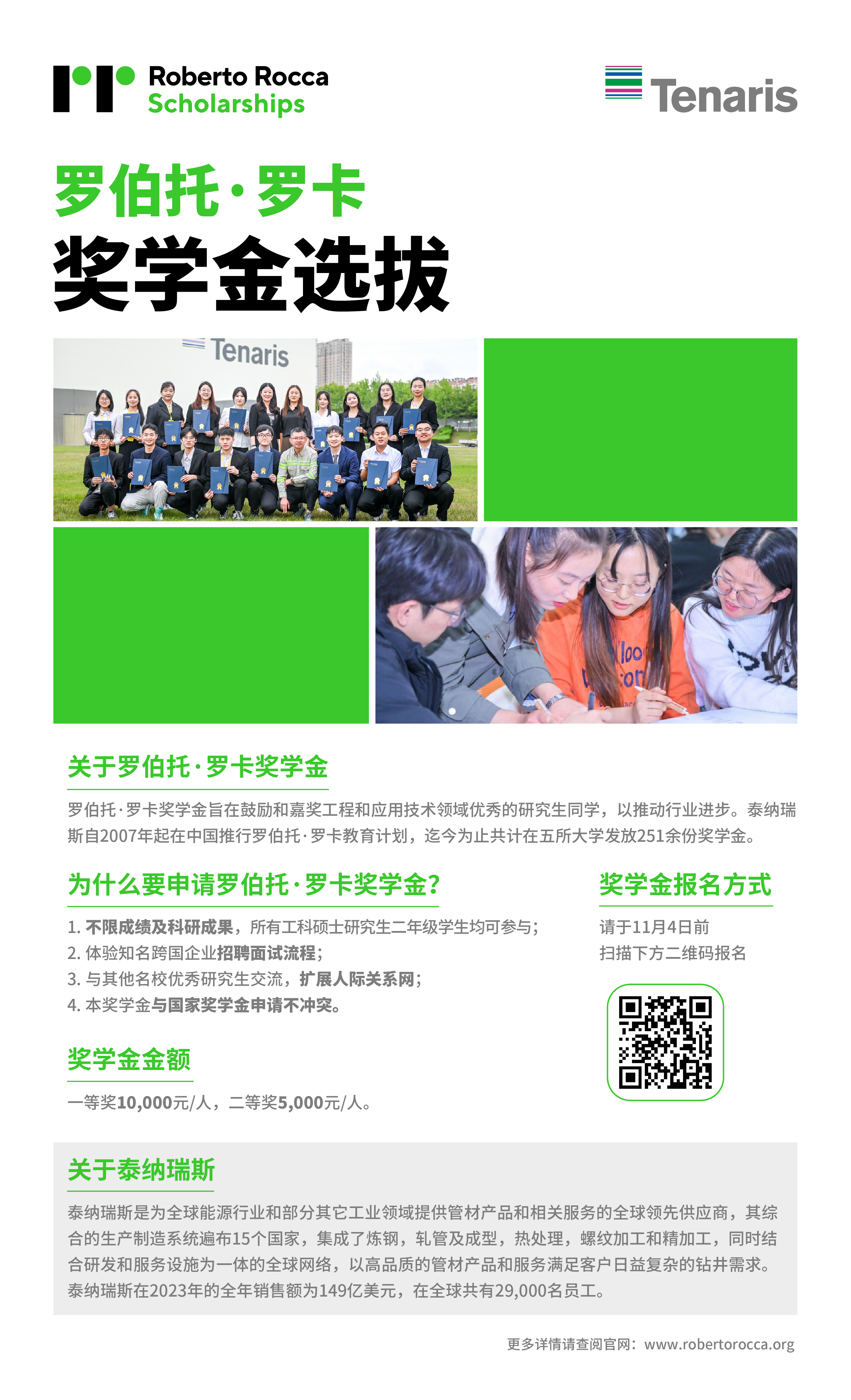 泰纳瑞斯2024年度奖学金选拔项目已开启,为方便大家参与,今年的公司宣讲将以线上形式进行,其他奖学金评选活动线下举办。