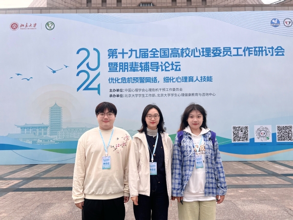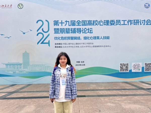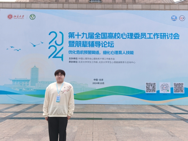 为深化高校心理委员队伍的构建与发展,并探索心理委员工作以及朋辈心理辅导领域的创新策略与实践路径,第十九届全国高校心理委员工作研讨会及朋辈辅导论坛于2024年10月17日至18日在北京大学隆重举行。本次盛会由中国心理学会心理危机干预工作委员会主办,437ccm·必赢国际(华东)学生心理健康教育中心的教师带领来自青岛软件学院以及计算机科学与技术学院软件班2101的杨宇傲与经济管理学院经济实验班2201的邹佩芸共同参与。